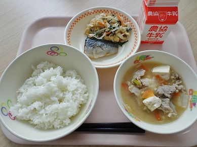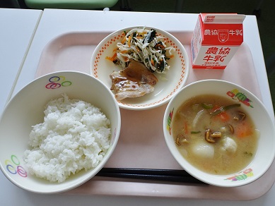 牛乳、ごはん、ぶた肉のクワ焼き、磯香和え、いものこ汁