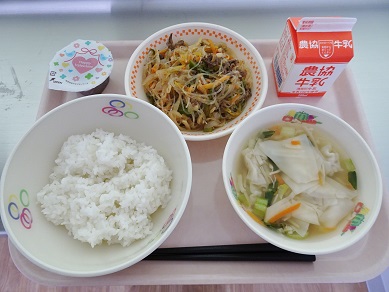 牛乳、ごはん、チャプチェ、ワンタンスープ、バレンタインデザート