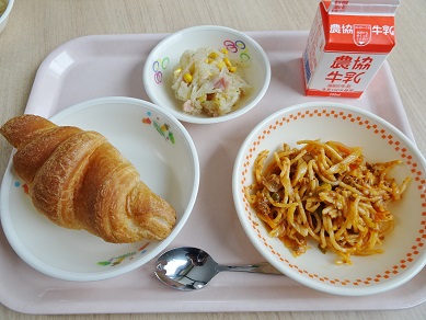 牛乳、クロワッサン、スパゲティソテー、ジャーマンポテト