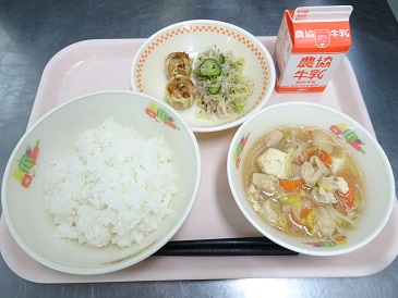 ごはん、揚げシュウマイ、ゆかりあえ、とり野菜、牛乳
