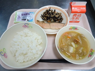 ごはん、鮭の塩焼き、ひじきの炒め煮、いものこ汁、昆布の佃煮、牛乳