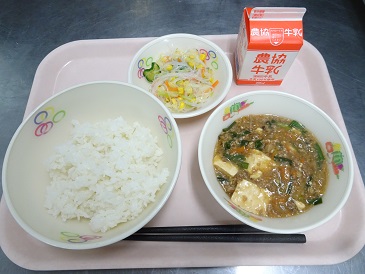 ごはん、マーボー豆腐、春雨サラダ、牛乳