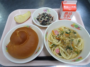 ミルクロール、カレーうどん、ひじきサラダ、フルーツ、牛乳
