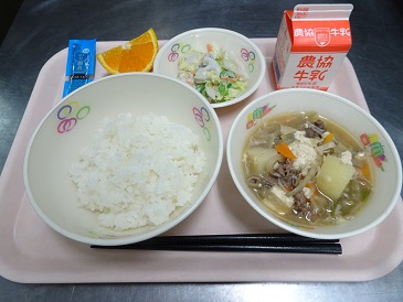 ごはん、すき焼き風煮、れんこんサラダ、フルーツ、のりの佃煮、牛乳