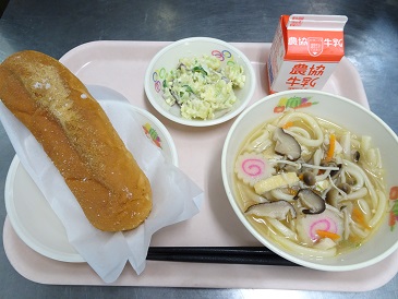 きなこ揚げパン、きのこうどん、おさつサラダ、牛乳