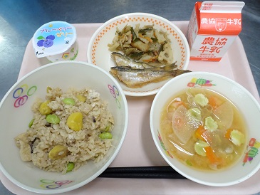 能登栗のごはん、ハタハタのいしるフライ、加賀れんこんと茎ワカメのキンピラ、栄養たっぷりうち豆汁、甘酸っぱいブルーベリーゼリー、牛乳