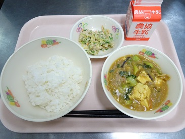 ごはん、とうふのカレー煮、バンバンジーサラダ、牛乳