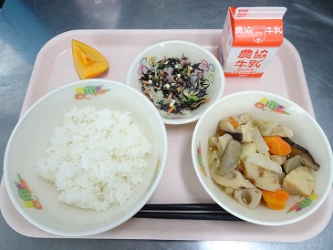 ごはん、いりどり、ひじきサラダ、フルーツ、牛乳