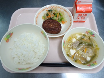 ごはん、ハンバーグ、ごま和え、茎ワカメとキムチのスープ、牛乳