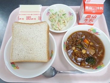 はいが食パン、ビーフシチュー、ツナサラダ、スライスチーズ、牛乳