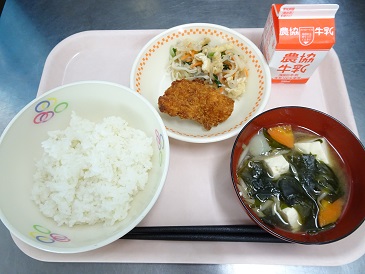 ごはん、チキンカツ、五目なます、みそ汁、牛乳