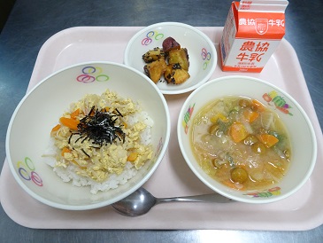 親子丼、なめこのみそ汁、大学芋、牛乳