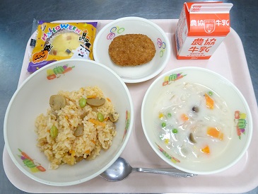 チキンライス、コロッケ、クラムチャウダー風スープ、ハロウィンデザート、牛乳