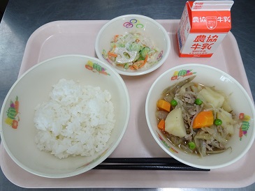 ごはん、肉じゃが、れんこんサラダ、牛乳