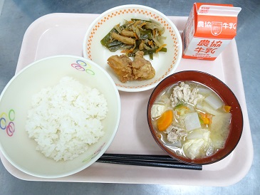 牛乳、ごはん、鶏のからあげ、茎ワカメのキンピラ、豚汁