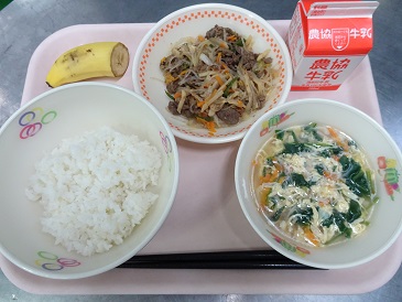 牛乳、ごはん、チャプチェ、トックスープ、フルーツ