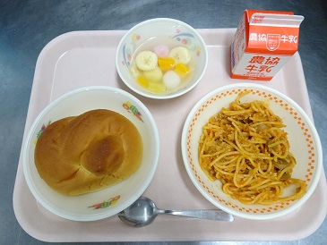 牛乳、キャロットパン、ミートソーススパゲティ、フルーツポンチ