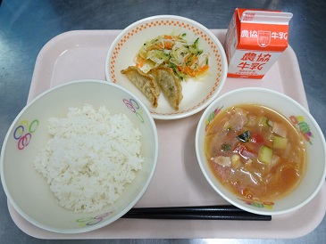 牛乳、ごはん、揚げぎょうざ、金糸瓜サラダ、夏野菜のイタリアンスープ