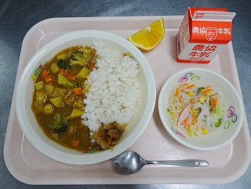牛乳、チキンカレー、春雨サラダ、フルーツ、福神漬け
