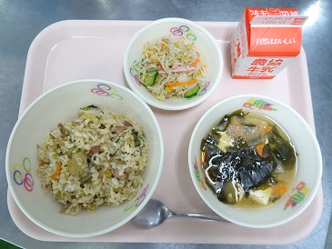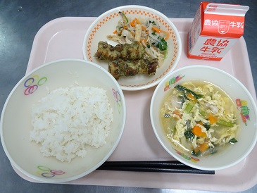 牛乳、ごはん、竹輪の磯辺揚げ、五目なます、たまごスープ