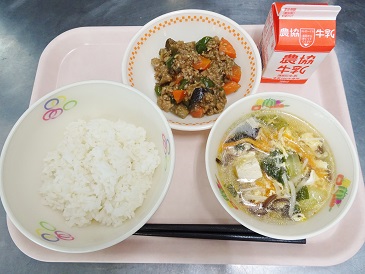 牛乳、ごはん、なすの肉みそ和え、サンラータン