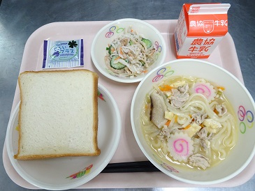 牛乳、ミルク食パン、肉うどん、かみかみサラダ、ジャム