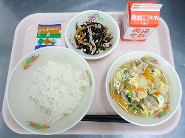 牛乳、ごはん、卵とじ、ひじきのマリネ、ふりかけ