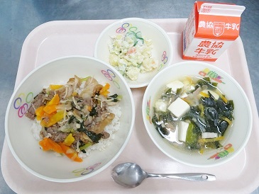 牛乳、牛丼、ポテトサラダ、わかめスープ