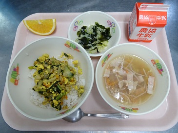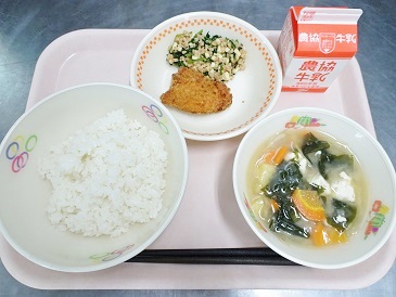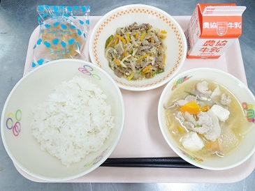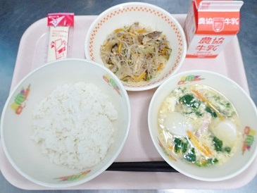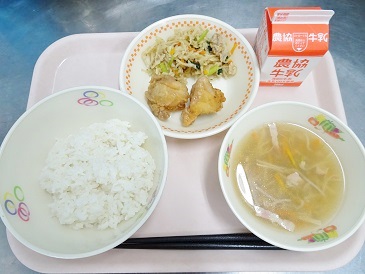 牛乳、ごはん、鶏肉のレモン風味、切り干しのぴりから炒め、千切りスープ