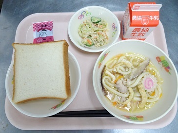 牛乳、ミルク食パン、五目うどん、バンバンジーサラダ、クリーム