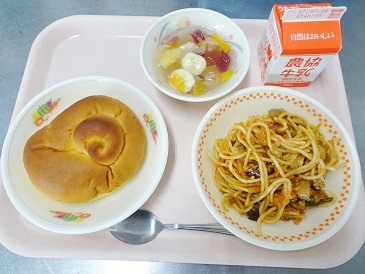 牛乳、キャロットパン、夏野菜スパゲティ、フルーツポンチ