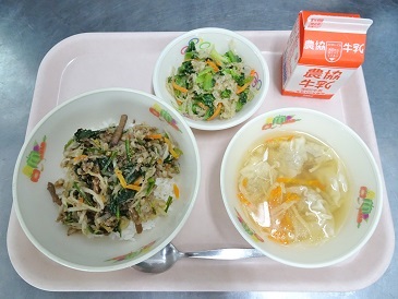 牛乳、ビビンバ、ごま和え、ワンタンスープ