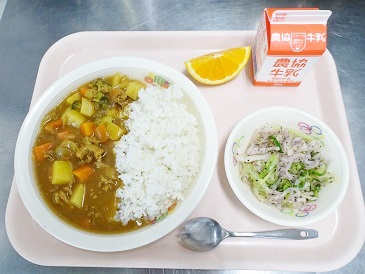 牛乳、ポークカレー、ゆかりあえ、フルーツ