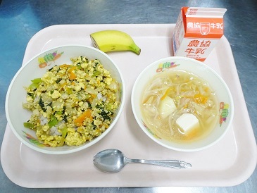 牛乳、ソボロごはん、中華スープ、フルーツ