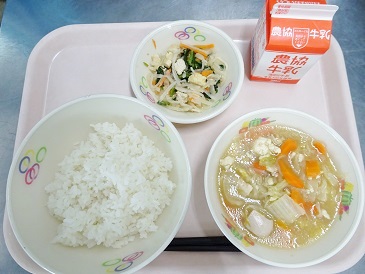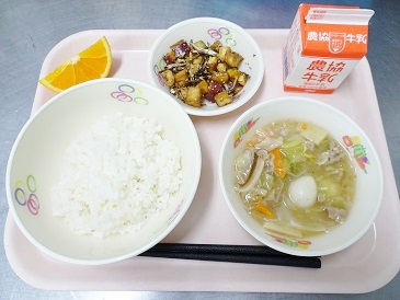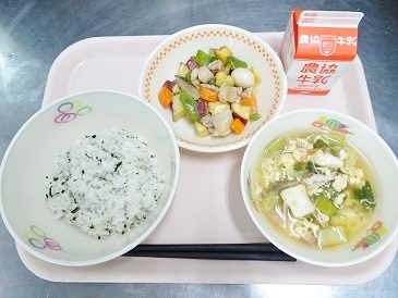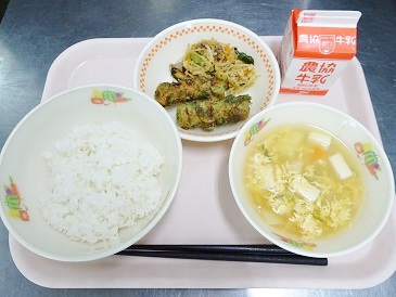 牛乳、ごはん、竹輪の磯辺揚げ、切り干しのぴりから炒め、かきたま汁、牛乳