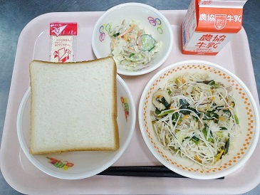 牛乳、ミルクロール、焼きビーフン、ごぼうサラダ、チーズ