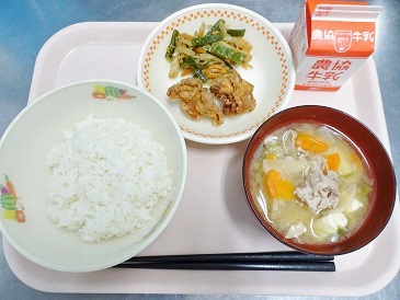 牛乳、ごはん、とりの唐揚げ、茎ワカメのキンピラ、とん汁