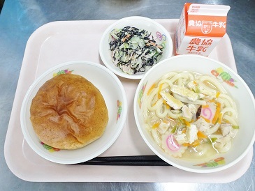 牛乳、はいがバンズ、うどんスープ、ひじきサラダ