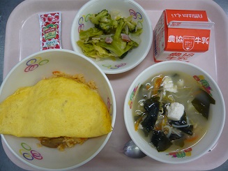 オムライス、ワカメスープ、ブロッコリーソテー、牛乳