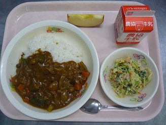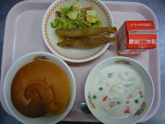 ミルクロール、クリームシチュー、ししゃもフライ、りんごサラダ、牛乳