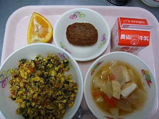 ソボロごはん、ハンバーグ、みそ汁、いよかん、牛乳