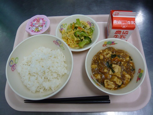 ごはん、マーボー豆腐、卵サラダ、お祝いゼリー,牛乳