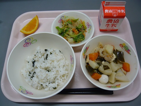 ワカメごはん、含め煮、ごま和え、フルーツ、牛乳