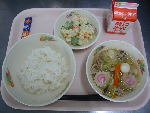 2017年4月10日 14時27分ごはん、八宝菜、ポテトサラダ、ふりかけ、牛乳