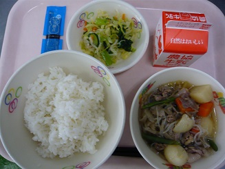 ごはん、肉じゃが、大根サラダ、のりの佃煮、牛乳
