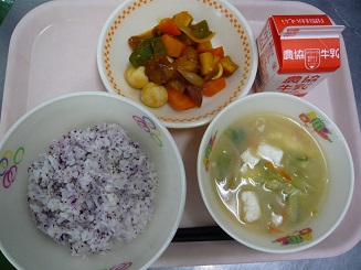 ゆかりごはん、酢豚、千切りスープ、牛乳