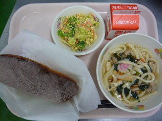 ココア揚げパン、五目うどん、卵サラダ、牛乳