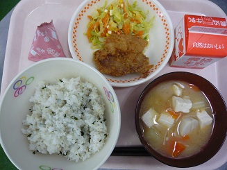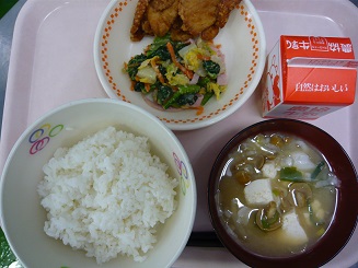 ごはん、とりのから揚げ、ごま和え、みそ汁、牛乳