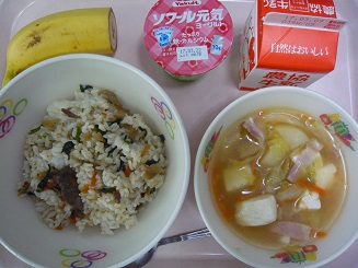 ビーフライス、中華スープ、ヨーグルト、バナナ、牛乳