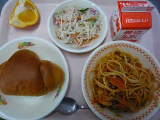 バターロール、スパゲティソテー、カミカミサラダ、いよかん、牛乳